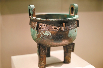 在此次展出的青銅器中,有一部分是僅銘有族氏銘文的,即家族的名號,以表示是該物品的所屬人。代表族徽的銘文,象形的程度會比較高,主要用作禮器。比如展出的鳥父甲鼎,內(nèi)里的銘文就是自上而下三個字,其中“鳥”字則幾乎完全是鳥的象形,這個鳥就是鳥族的族徽,鳥族族群在當(dāng)時十分龐大。而后面兩個字就是“日名”,日名是指古人對逝人的稱謂,一般以甲乙丙丁戊己庚辛壬癸十天干前加上受祭者的輩分格式出現(xiàn)。這種禮器又叫做日名器,既點明了受祭者,又表明了作器者和受祭者的關(guān)系。