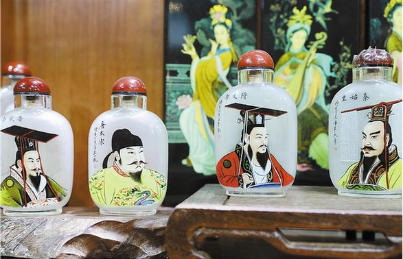 談及創(chuàng)作過程,楊藝說,鼻煙壺內畫的制作,一般是在水晶壺或素玻璃壺內壁,用特制的細筆,蘸取少許墨汁顏料,從小口中深入瓶中,反手作畫。創(chuàng)作內畫,在常人看來,不可思議之處是有限的空間以及需要反手作畫,這也是每一個內畫師面臨的主要難題所在,“創(chuàng)作內畫時,需要在這盈寸天地間做到手指和筆桿揮灑自如,這極其考驗一個人的耐性。一手執(zhí)壺,一手作畫,作畫時需要在壺內反手描繪,如此,才能讓人們在外部看到正面的畫像結構。”內畫的難度還在于,要長期低頭畫畫,因此還導致頸椎疼痛,中途為了治療疼痛休畫了好長一段時間。