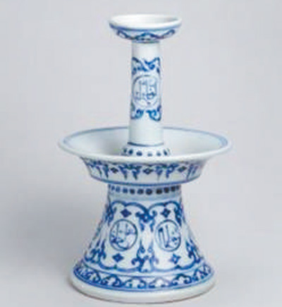 這是一件明正德年間的青花燭臺(tái)。燭臺(tái)很復(fù)雜,由四部分組成,最上端為蠟燭插口,外壁繪如意云頭紋;其下為燭臺(tái)細(xì)長支柱,中部繪圓形開光,開光內(nèi)書寫阿拉伯文,上下分別繪勾蓮花枝紋及菱形紋。再下為承托圓盤,也繪如意云頭紋;最下端為喇叭形臺(tái)座,也繪圓形開光,開光內(nèi)書寫阿拉伯文,開光上下分別繪勾蓮花枝紋及菱形紋。燭臺(tái)上的阿拉伯文與傳統(tǒng)紋飾,表現(xiàn)出阿拉伯文化與中華傳統(tǒng)文化的交融。