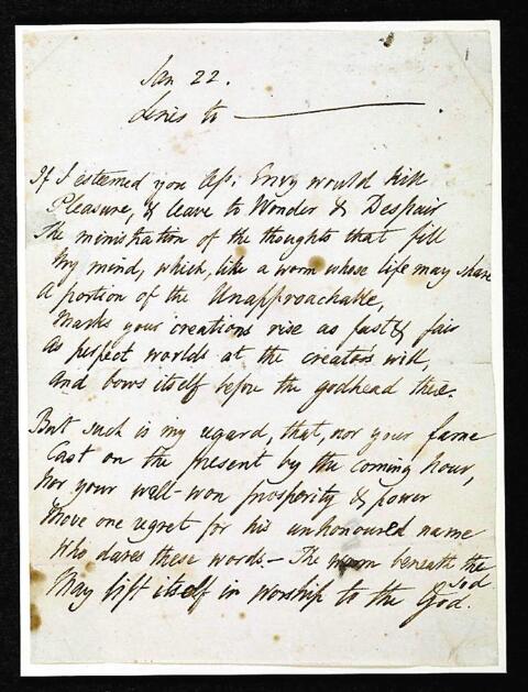 ▲珀西·比希·雪萊的《致拜倫的十四行詩》草稿。