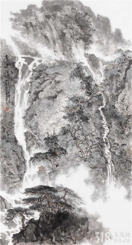 我以為,范陽(yáng)先生是真正在心性上貼近古人“不下堂筵,坐窮泉壑”,其現(xiàn)居贛中名岳武功山、楊岐山之中。尤其武功山,史上與衡山、廬山并稱江南三大名山,被冠以“衡首廬尾武功中”,山脈綿延浩瀚,茫茫無(wú)際。范陽(yáng)先生終日面山臨壑,弄筆自適,得武功真容。山水畫從來(lái)就不是簡(jiǎn)單的描摹自然的風(fēng)光,無(wú)論丘園養(yǎng)素還是泉石嘯傲,都是畫者精神的自然流露,這是畫家筆墨情態(tài)的表達(dá),亦是畫家藝術(shù)境界追求的體現(xiàn)。對(duì)于山林的描繪,承載了畫者對(duì)泉石意趣的向往,對(duì)于林下境界的追求。范陽(yáng)先生的山水畫作品長(zhǎng)于布景,對(duì)山中的“陰、晴、朝、夕”的細(xì)膩描繪都有他自已獨(dú)特感悟和表達(dá)。筆下極丘壑浩渺之勢(shì),奇峰羅列,宛有風(fēng)骨,深壑幽谷,其勢(shì)超峻;至于松柏掩映,峭壁涌泉,野道幽麓,于野逸之態(tài)甚備。范陽(yáng)先生數(shù)十年來(lái)遍臨南北宗諸家,遠(yuǎn)溯元人四家,清初四王,近至黃秋園,上下求索,崇穆有加,最終歸皈真逸正脈。新近年逾七十之作,日漸精熟,蒼腴古厚,更趨融古化古之態(tài),細(xì)究其筆下蹤跡:子久?麓臺(tái)?秋園?各不相肖,而莫不精備。諦觀其中景象:匡廬?武功?羅霄?渾然而化,不一而足。如此境地當(dāng)稱“妙解”。