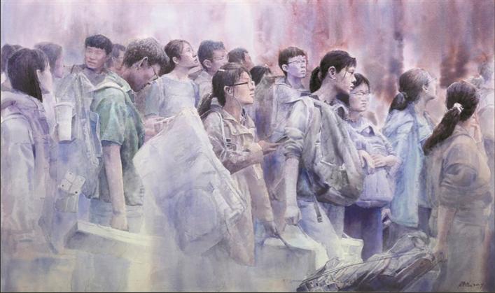 藝術(shù)家方曉龍此次有兩件作品入選,分別是水彩畫《追夢(mèng)》和與青年藝術(shù)家張凱合作的油畫《掠過晨曦的夢(mèng)想》。兩幅作品聚焦同一主題——青年學(xué)子參加藝考,這來自他對(duì)這一題材長年累月的觀察。