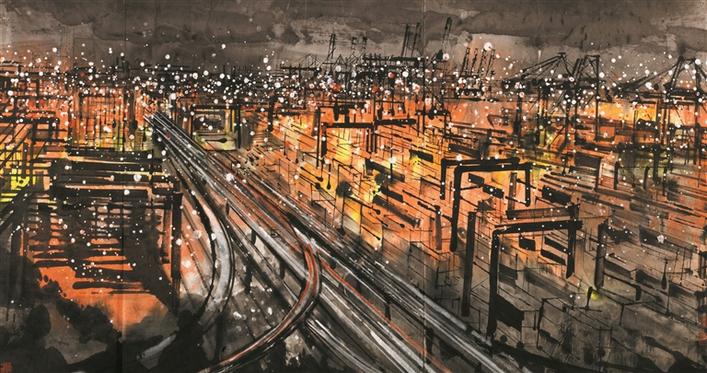 楊曉洋創(chuàng)作的《東方巨港——璀璨鹽田》是此次入選的國畫作品之一。作品以深圳港夜色為主題,體現(xiàn)了中國改革開放前沿城市深圳滄海桑田的巨變和這座城市的繁榮景象。同樣是表現(xiàn)現(xiàn)代題材的城市景觀,從楊曉洋的作品中就可看出以對(duì)版畫的黑白對(duì)比手法、平面構(gòu)成的象征形式、夜景特色的表現(xiàn)手法的出色運(yùn)用等方式來表達(dá)出作者對(duì)都市景觀的趣味。
