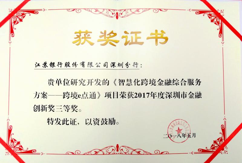 “五次榮獲深圳市政府金融創(chuàng)新獎,既是對江蘇銀行深圳分行多年來對創(chuàng)新孜孜以求的肯定,更激勵著我們在嚴監(jiān)管、去杠桿宏觀背景下,乘粵港澳國際大灣區(qū)之東風,進一步完善創(chuàng)新管理機制,發(fā)揚和傳承首創(chuàng)精神,爭做‘政治和擔當過硬、創(chuàng)新發(fā)展和特色彰顯、總行和監(jiān)管放心’的好銀行,為實現(xiàn)‘特色化、智慧化、綜合化、國際化’的一流上市銀行目標不懈奮斗!”江蘇銀行深圳分行負責人表示。