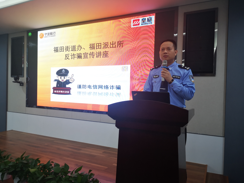 近日,寧波銀行深圳分行攜手深圳福田街道辦、福田派出所對皇庭中心大廈100多位商戶代表,開展了一場教育意義深刻的反詐騙知識講座。