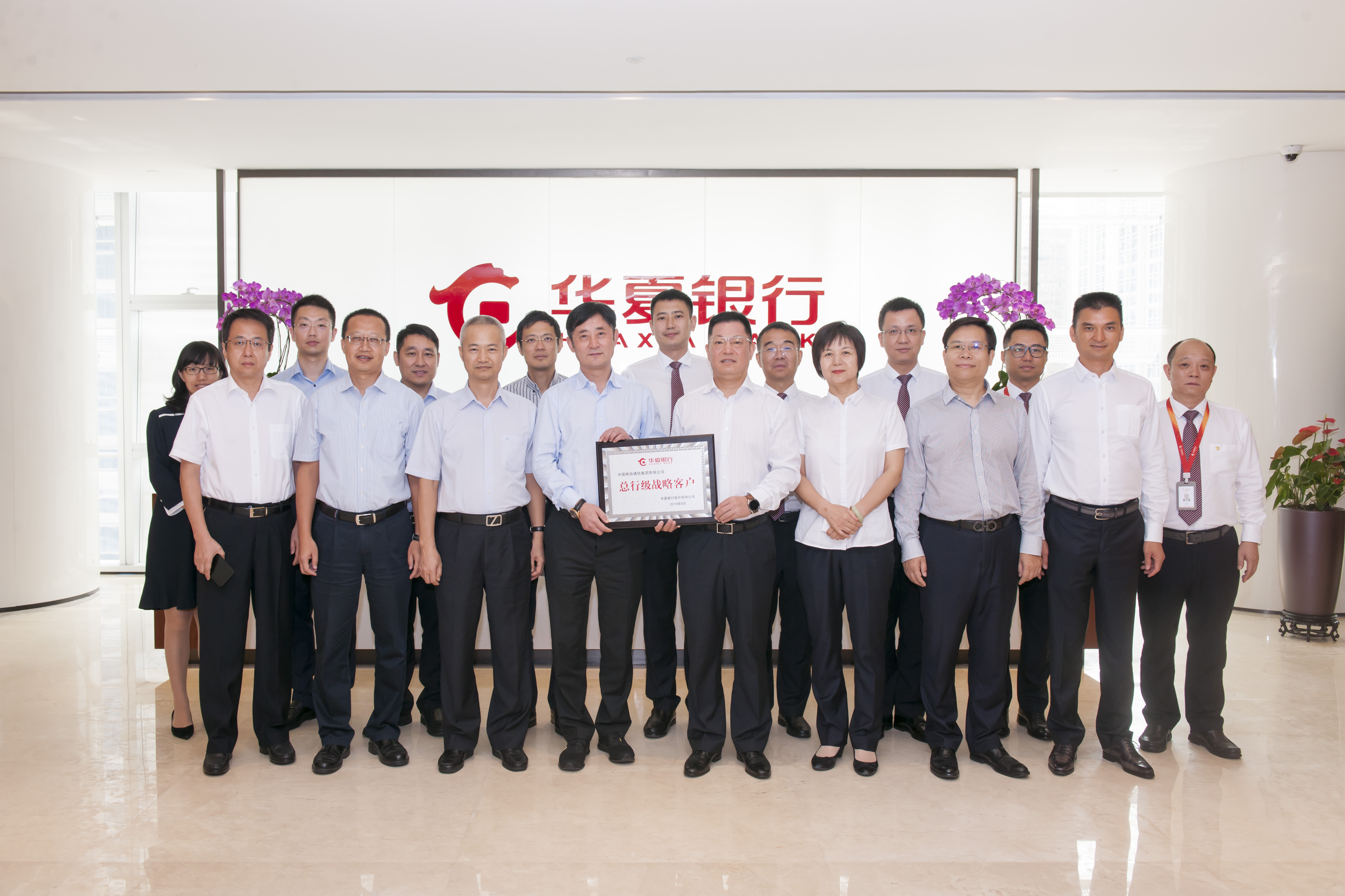 簽約儀式前,華夏銀行深圳分行受總行委托向中國移動(dòng)通信集團(tuán)有限公司頒發(fā)“總行級(jí)戰(zhàn)略客戶”牌匾。