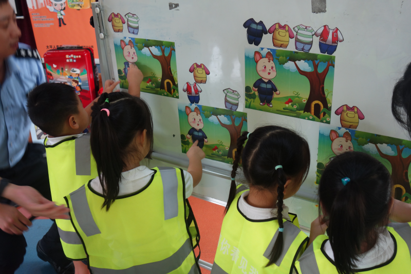 熊警官?gòu)慕煌üぞ咧v起,分別講述了乘坐不同交通工具所帶來(lái)的風(fēng)險(xiǎn)及注意事項(xiàng),并通過幽默風(fēng)趣的“兒童安全座椅”小視頻,提醒在座的小朋友及家長(zhǎng)要注意細(xì)節(jié),具有防范風(fēng)險(xiǎn)的意識(shí)。在互動(dòng)游戲環(huán)節(jié),熊警官通過與小朋友們的互動(dòng),講解了紅綠燈的來(lái)源、日常的交通標(biāo)識(shí)以及過馬路的規(guī)則?,F(xiàn)場(chǎng)的同學(xué)們也非常踴躍,在“被看見才安全”環(huán)節(jié)時(shí),許多小朋友主動(dòng)上臺(tái),給小兔子穿上最亮最顯眼的衣服,使其成為最靚的仔。