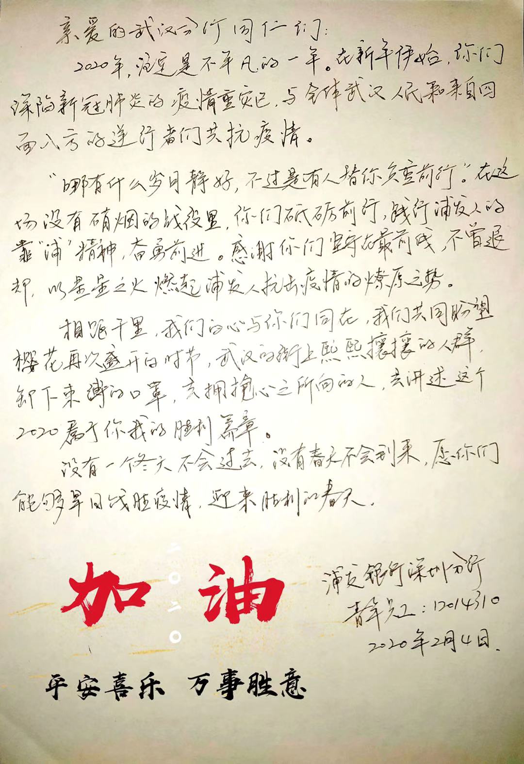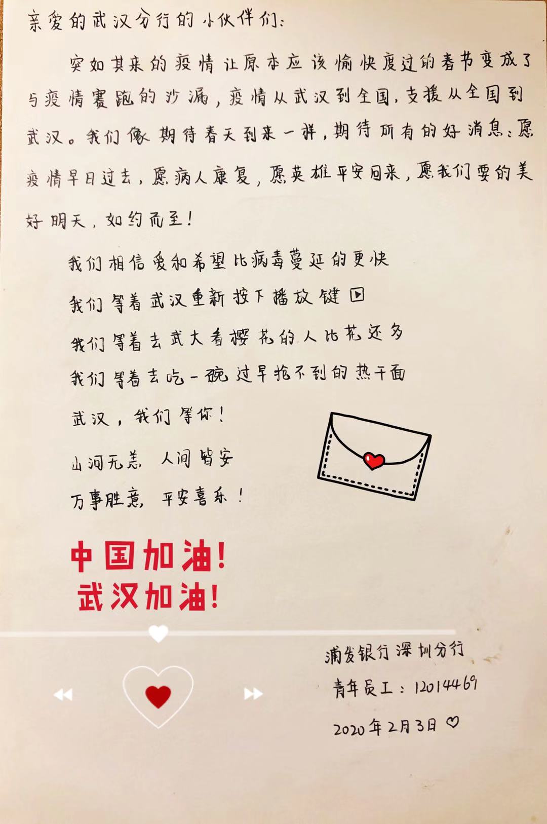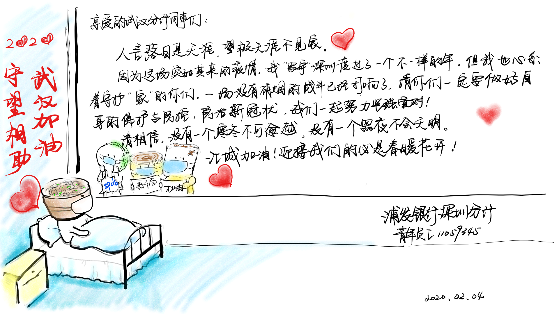 2月3日,浦發(fā)銀行深圳分行團(tuán)委向全體青年員工發(fā)出了一封倡議書。在倡議書中,該行團(tuán)委號召廣大團(tuán)干部、團(tuán)員青年立即行動,充分發(fā)揮黨的助手和后備軍作用,展現(xiàn)青年突擊隊(duì)作為,為堅(jiān)決打贏疫情防控阻擊戰(zhàn)貢獻(xiàn)力量,并向青年提出三個要求:“堅(jiān)定信心不迷茫,聽黨指揮勇?lián)?dāng)”、“科學(xué)防范不信謠,眾志成城控疫情”、“居家辦公不離崗,服從指揮勇?lián)?dāng)”。當(dāng)日,浦發(fā)銀行深圳分行發(fā)起了給武漢分行同事寄送家書的活動,該行全體青年手寫家書,圖文并茂、紙短情長,表達(dá)了對疫區(qū)“戰(zhàn)友們”最深切的關(guān)愛和鼓勵,身體力行做好他們堅(jiān)強(qiáng)的后盾。