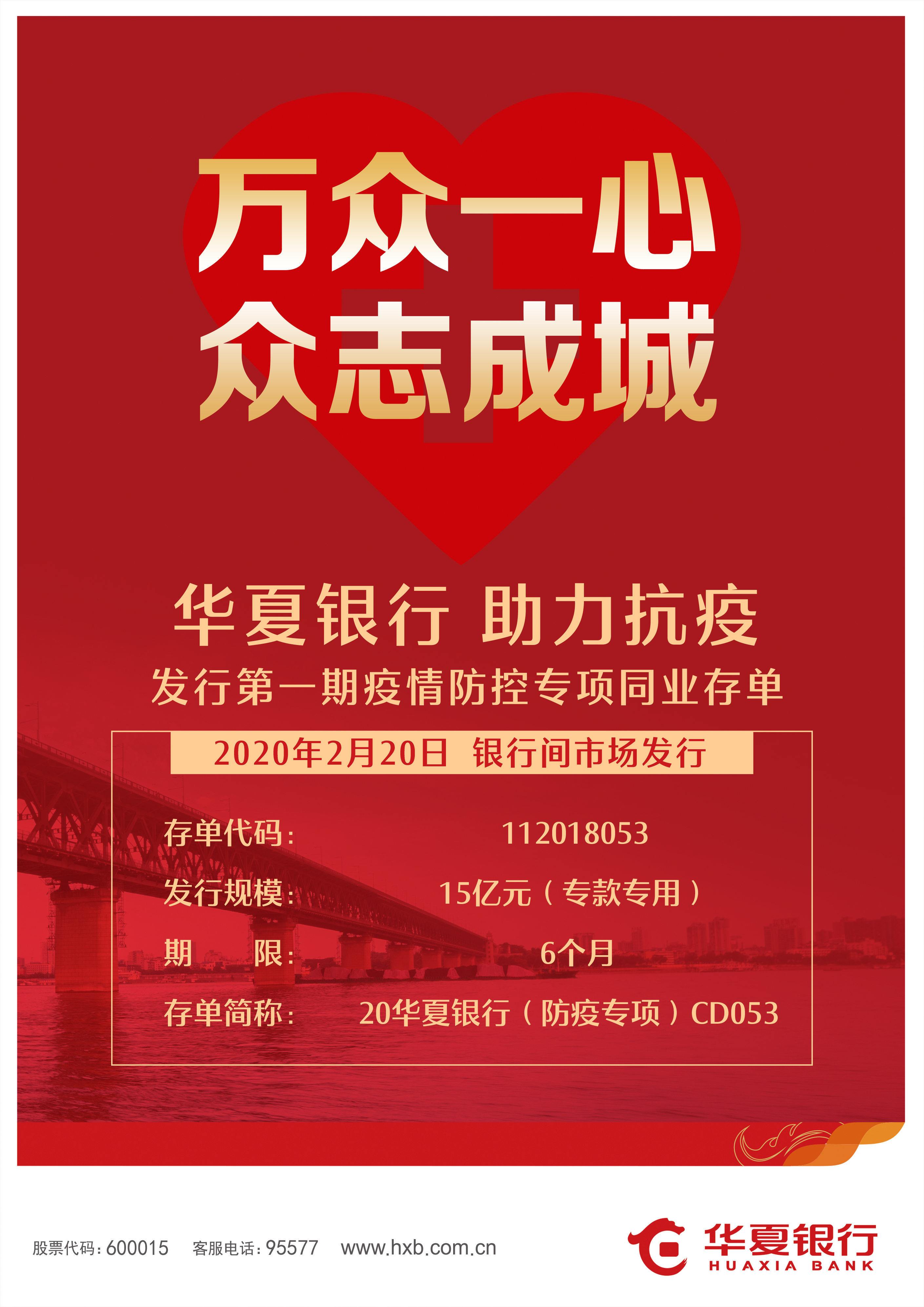深圳新聞網(wǎng)2月20日訊 華夏銀行迅速響應(yīng)人民銀行疫情防控相關(guān)工作要求,于2月20日在全國(guó)銀行間市場(chǎng)成功發(fā)行疫情防控專項(xiàng)同業(yè)存單,為疫情防控提供資金支持。本期防疫專項(xiàng)存單發(fā)行規(guī)模15億元,發(fā)行期限6個(gè)月,發(fā)行利率2.40%,發(fā)行獲得了各類投資機(jī)構(gòu)的廣泛關(guān)注,投資者涵蓋城商行、農(nóng)商行、證券公司和基金公司等不同類型的20多家金融機(jī)構(gòu)。