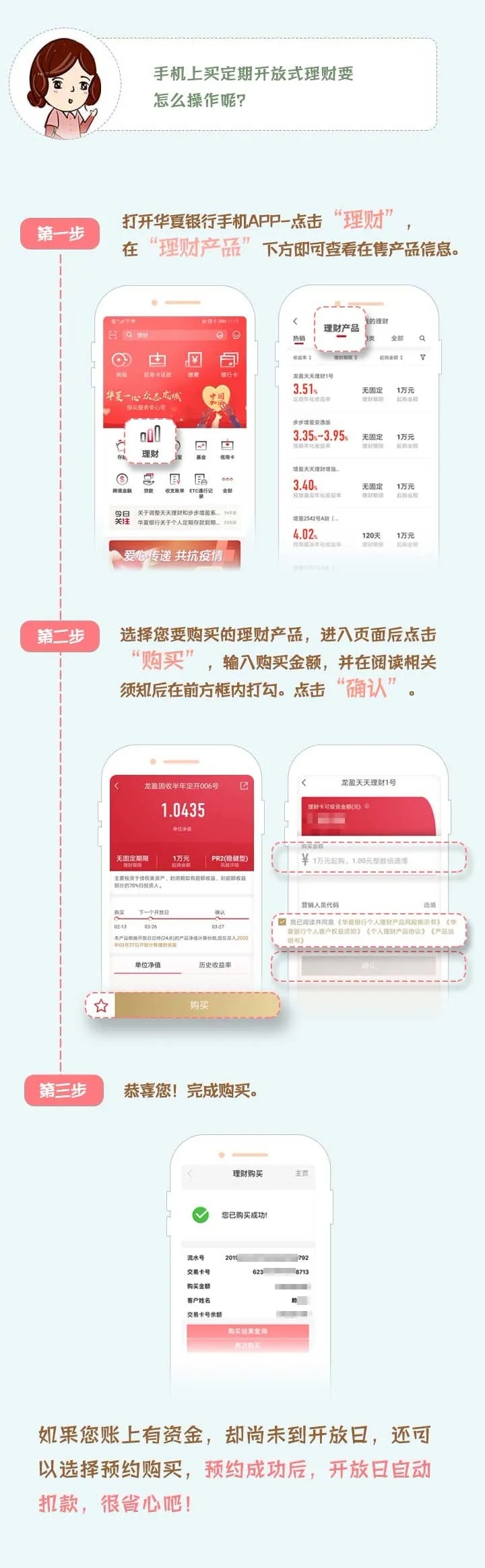 在購(gòu)買理財(cái)產(chǎn)品前,首先要進(jìn)行風(fēng)險(xiǎn)評(píng)估,確認(rèn)您的風(fēng)險(xiǎn)承受能力,選擇與您風(fēng)險(xiǎn)偏好相匹配的理財(cái)產(chǎn)品。建議您務(wù)必詳細(xì)閱讀每一款理財(cái)產(chǎn)品說(shuō)明書,了解該產(chǎn)品的風(fēng)險(xiǎn)、收益以及到賬時(shí)間等。