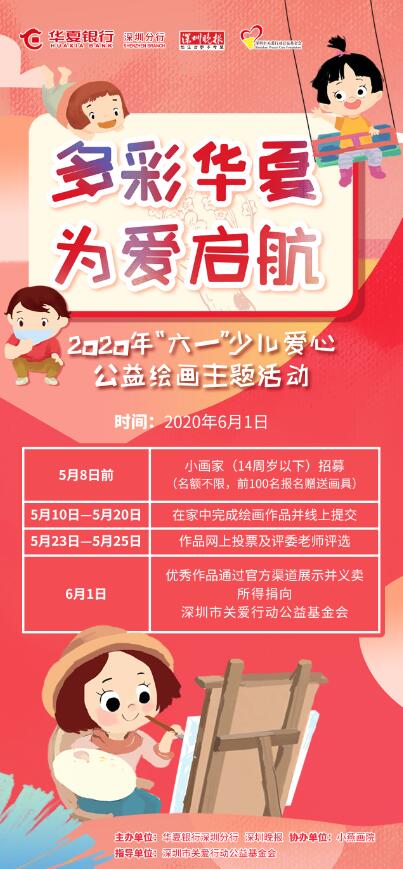 據(jù)了解,該活動是由華夏銀行深圳分行攜手深圳晚報、小燕畫院開展的“多彩華夏為愛啟航”少兒愛心公益繪畫。活動向深圳市民招募小畫家,邀請他們用手中畫筆描繪精彩世界。同時,將繪畫賦予公益與愛心,評選出部分優(yōu)秀作品進行線上義賣,以點亮地貧兒童的生命之光。
