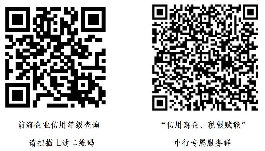 前海注冊企業(yè)可通過下左二維碼查詢前海信用等級,可通過下右二維碼加入“信用惠企、稅銀賦能”中行專屬服務(wù)群(入群請備注企業(yè)名稱),了解咨詢深圳中行針對前?!氨趟{企業(yè)”和“湛藍企業(yè)”的十項具體服務(wù)內(nèi)容。(黃璜)