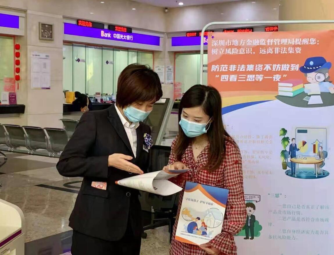 在活動開展期間,光大銀行深圳分行在網(wǎng)點擺放了防范非法集資的宣傳展架,并向前來辦理業(yè)務的市民主動發(fā)放防范非法集資宣傳手冊。宣傳冊上詳細介紹了非法集資相關的金融知識,包括非法集資的特征、表現(xiàn)形式和常見手段,摘錄了相關的法律法規(guī)和政策,用非法集資案例生動形象的說明危險就在身邊。該行網(wǎng)點員工還針對客戶提出的疑問給予詳細講解,并提醒客戶,遠離非法集資,守好自己的“錢袋子”。