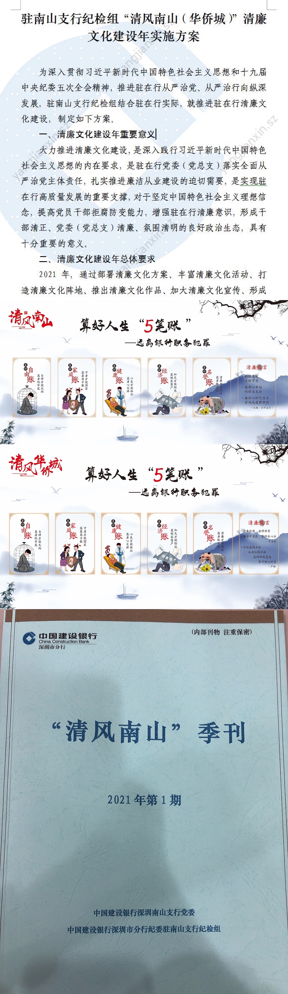深圳新聞網(wǎng)6月9日訊 為充分發(fā)揮清廉文化的教育、激勵、凝聚、導(dǎo)向和約束作用,響應(yīng)深圳銀行業(yè)保險(xiǎn)業(yè)清廉金融文化核心理念,積極培育厚德養(yǎng)廉的政治生態(tài),著力助推駐在行干部清正、黨委清廉、政治清明、生態(tài)清朗的清廉文化建設(shè),近日,建行深圳市分行駐南山支行紀(jì)檢組制定推出了《“清風(fēng)南山(華僑城)”清廉文化建設(shè)年實(shí)施方案》。該方案以“6講”為依托,明確清廉文化建設(shè)5大任務(wù),即:弘揚(yáng)清廉價(jià)值理念、豐富清廉文化活動、打造清廉文化陣地、推出清廉文化作品、攜手清廉文化共建。