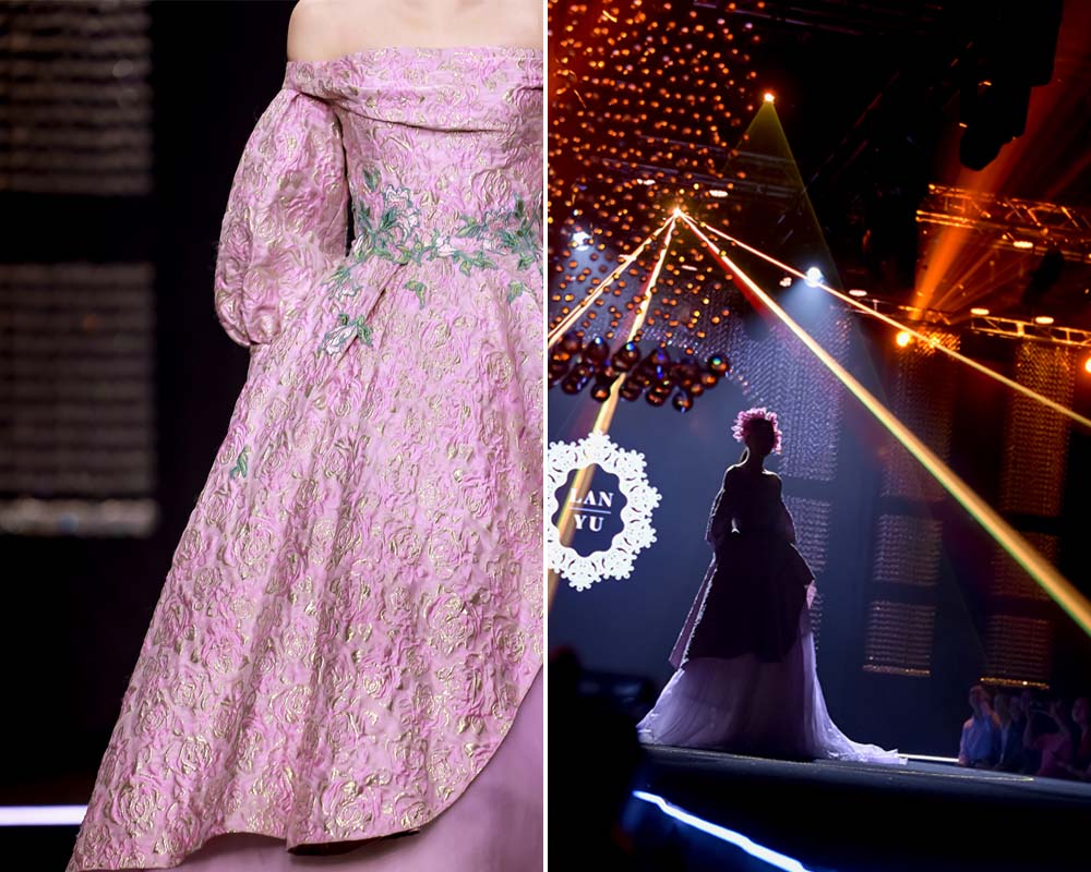 現(xiàn)場更有LANYU高定禮服展示,將中式美學(xué)意境與西式時尚剪裁完美融合,同時加重了蘇繡非遺元素的應(yīng)用比例,將更多的非遺技藝融入服飾創(chuàng)作中,呈現(xiàn)出超高藝術(shù)水準(zhǔn)。