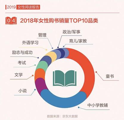 京東大數(shù)據(jù)顯示,女性的讀書量顯著提升,2018年,女性讀者人均購書7.6本,高于男性,女性讀者在紙質(zhì)書購買上的人均消費(fèi)近230元,女性的“閱讀力”正在變得越來越強(qiáng)。從圖書銷量上看,2018年女性讀者購買最多的圖書是童書、中小學(xué)教輔、小說、文學(xué)和考試,可見對(duì)于大部分女性而言,購書的主要目的是出于育兒的需求。