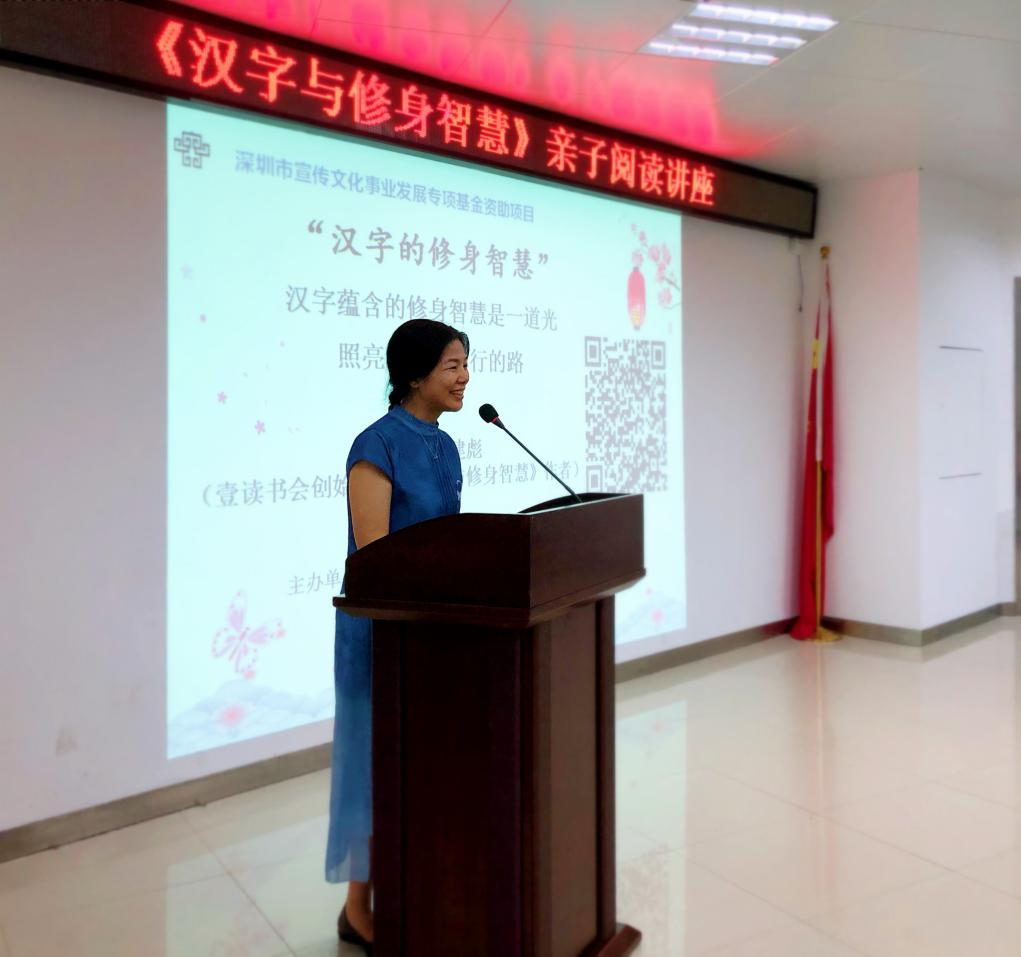 8月23日,首場公益講座“漢字蘊含的修身智慧是一道光,照亮青少年前行的路”在龍湖社區(qū)黨群服務(wù)中心舉辦。講座由深圳市閱讀聯(lián)合會、深圳市壹書文化傳播有限責(zé)任公司、龍湖社區(qū)黨委共同主辦。講座開始前,活動室坐滿了對傳統(tǒng)文化感興趣的青少年和他們的家人。每位小朋友都拿到了工作人員發(fā)放的《漢字與修身智慧》一書,并在家長的陪同下迫不及待翻開書籍,感受其中圖文并茂的漢字故事。龍湖社區(qū)黨委羅黎靜書記擔(dān)任本次講座的主持人,通過話家常開場,告訴聽眾漢字蘊含的智慧無窮無盡,點燃了在場的家長和小朋友們與主講嘉賓互動的激情。