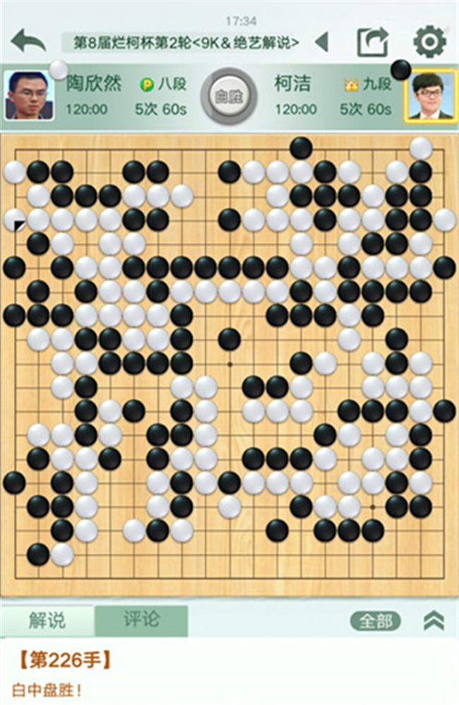 本局陶欣然執(zhí)白后行,以極具觀賞性的大模樣開(kāi)局,將局面導(dǎo)向他擅長(zhǎng)的進(jìn)攻節(jié)奏。在中腹的作戰(zhàn)中,白方判斷精準(zhǔn),棋感敏銳,保持了很高的AI吻合度,一直良好地把握著局面。行至后半盤(pán),黑方柯潔開(kāi)始了他擅長(zhǎng)的逆風(fēng)攪局,多處挑起劫爭(zhēng)。好在陶欣然未出大錯(cuò),在混亂的局面下穩(wěn)住了局勢(shì),保持優(yōu)勢(shì)直至226手黑方投子認(rèn)負(fù)。