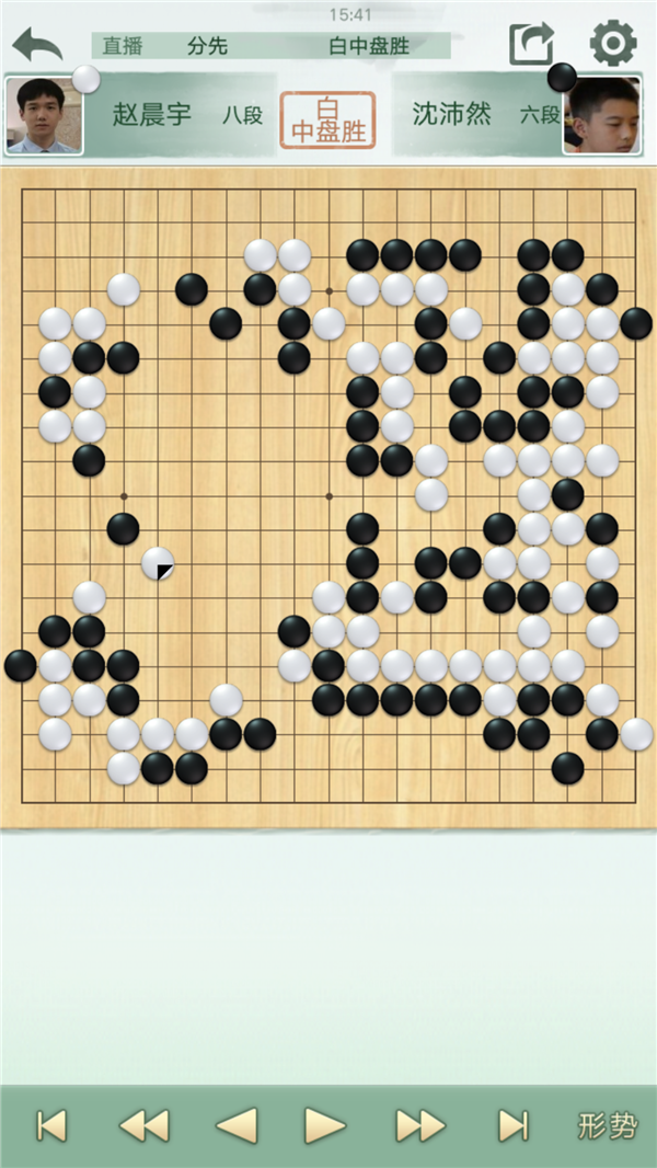 慢棋第四臺(tái)由深圳宏發(fā)隊(duì)的沈沛然六段執(zhí)黑對(duì)陣江蘇隊(duì)的趙晨宇八段。白方開(kāi)局步調(diào)良好,局面小優(yōu)。中盤(pán)時(shí)黑方企圖沖擊白棋薄味,但未能找到較為有效的手段。在形勢(shì)較為不利的情況下,沈沛然選擇了強(qiáng)行開(kāi)劫拼搏,但無(wú)奈劫材不夠,轉(zhuǎn)換之后繼續(xù)虧損,再難挽回局面,可以說(shuō)是白棋完勝的一局。