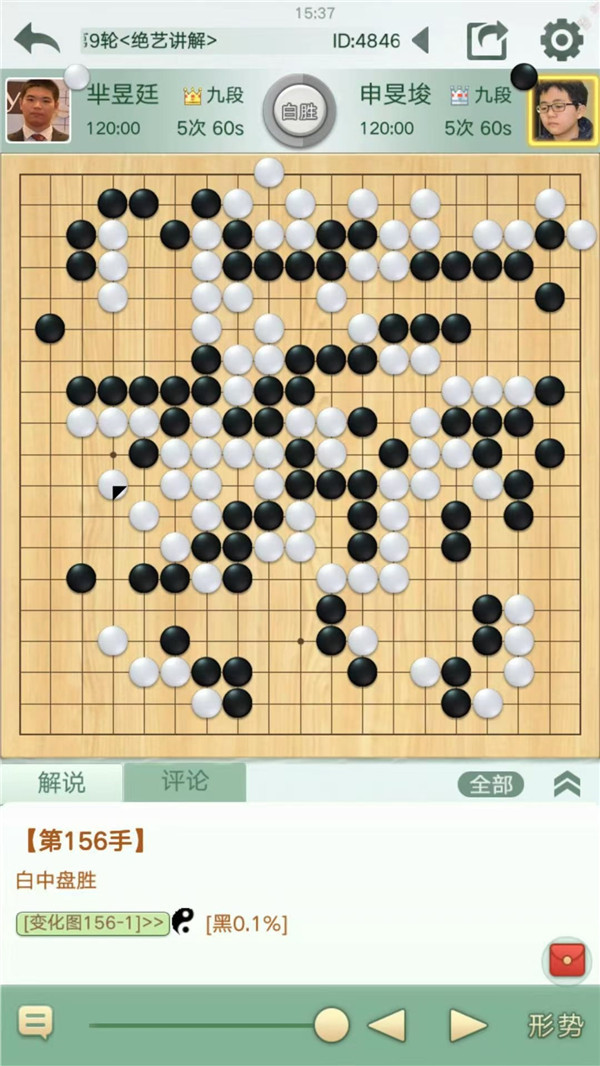 快棋臺(tái)由深圳宏發(fā)隊(duì)的時(shí)越九段執(zhí)白對(duì)陣江蘇隊(duì)的黃云嵩七段。開(kāi)局一個(gè)局部黑棋應(yīng)對(duì)欠妥,白方取得大優(yōu),然而時(shí)越之后的下法不夠簡(jiǎn)明,被黑棋抓住了機(jī)會(huì),局面變得混亂。在之后雙方大龍的接觸戰(zhàn)中,白方再次放棄簡(jiǎn)明做活的下法,與黑棋大龍形成雙活,但結(jié)局是外圍厚薄損失慘重,白棋下成后手雙活之后無(wú)暇顧及下方大龍安危,被黑棋一舉擊潰。