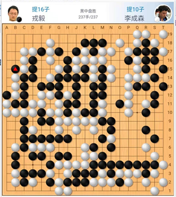 快棋臺(tái)由深圳隊(duì)的戎毅七段執(zhí)黑對(duì)陣天津隊(duì)的李成森五段。序盤(pán)平穩(wěn)過(guò)渡,進(jìn)入中盤(pán)時(shí)黑棋在白上方大空中試應(yīng)手,白棋最大程度強(qiáng)撐大空,留下隱患。在下方定型結(jié)束后,黑棋在白空中弈出巧手將白空打穿,取得領(lǐng)先。在劣勢(shì)情況下,白棋在爭(zhēng)搶官子時(shí)置中央大龍于不顧,黑棋攻殺白大龍順勢(shì)將白棋左下角吃掉,一舉獲勝。戎毅執(zhí)黑中盤(pán)勝李成森。
