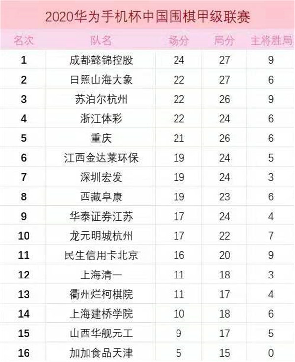 本輪深圳宏發(fā)隊(duì)3:1勝加加食品天津隊(duì)全取三分,目前積19分,暫列第七。本輪其它隊(duì)賽果如下:龍?jiān)鞒呛贾蓐?duì) 2:2 重慶隊(duì),上海建橋?qū)W院隊(duì) 1:3 成都懿錦控股隊(duì),華泰證券江蘇隊(duì) 3:1 江西金達(dá)萊環(huán)保隊(duì),日照山海大象隊(duì) 3:1 衢州爛柯棋院隊(duì),西藏阜康 3:1 上海清一,浙江體彩隊(duì) 3:1 民生信用卡北京隊(duì),蘇泊爾杭州隊(duì) 2:2 山西華艦元工隊(duì)。