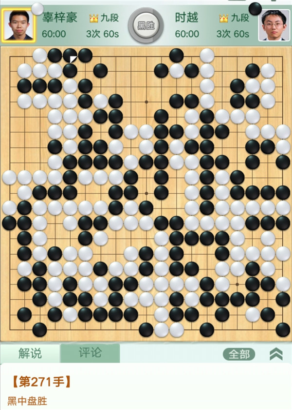 第四臺快棋,是兩位世界冠軍的對決,由深圳隊的時越九段執(zhí)黑快棋對陣江西隊的辜梓豪九段。開局至中盤雙方氣勢如虹,各自棄取,局面依然接近。之后黑棋下方定型失誤,白棋取得領(lǐng)先。在右下的劫爭中白棋判斷出現(xiàn)失誤,使黑棋扳回了局面。進(jìn)入官子階段,黑棋不顧中央隱患搶占右邊官子,白棋如果抓住機(jī)會在中央黑空出棋形成劫爭則局面復(fù)雜。實戰(zhàn)白棋沒敢開劫而是繼續(xù)收官,黑棋補(bǔ)棋后穩(wěn)固了勝勢,時越執(zhí)黑中盤勝辜梓豪。