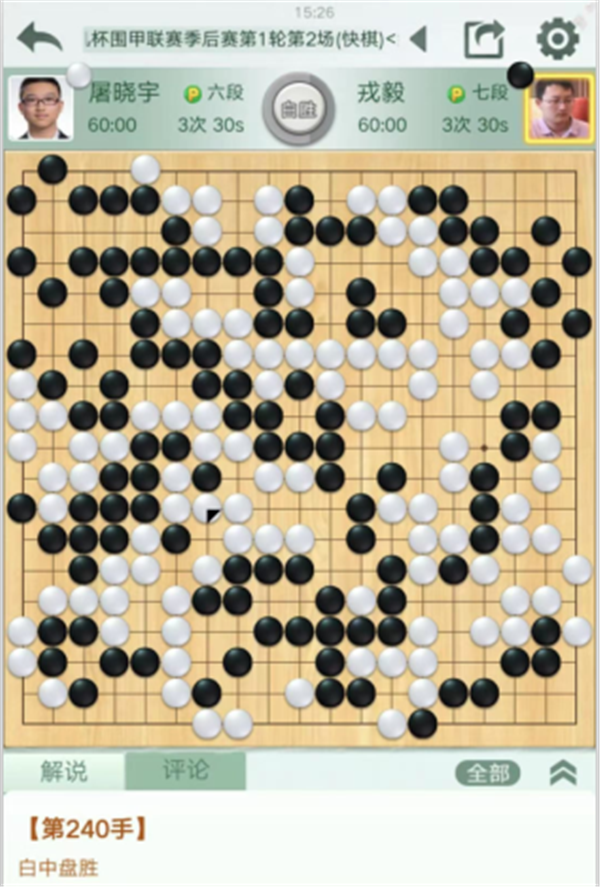 快棋臺由深圳隊戎毅七段執(zhí)黑對陣民生隊的屠曉宇六段。開局黑右上失誤失被白棋先手封住頭,虧損。中盤左邊作戰(zhàn)時候也應(yīng)該中央出頭,實(shí)戰(zhàn)貪吃左邊白棋,被白棋外側(cè)滾打包收后劣勢擴(kuò)大。之后黑棋左下隱患沒有及時自補(bǔ),被白棋將左下角吃掉,局面已經(jīng)難以挽回。戎毅中盤負(fù)屠曉宇。