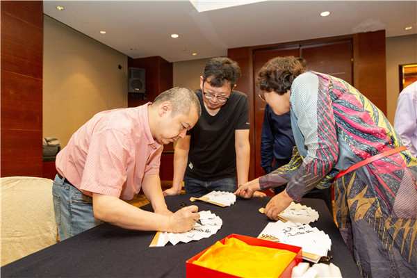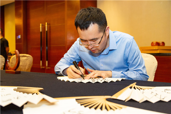 閉幕式上,嘉賓為圍棋愛(ài)好者折扇簽名。