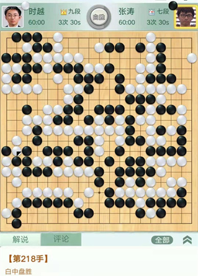 時越快棋執(zhí)白對陣張濤。右邊作戰(zhàn)時候,黑棋沒有選擇造劫劫爭而是退讓,被白將右邊幾子吃掉后又吃掉右上黑棋,黑棋局面落后。之后黑棋右下又死活看錯被白先手活出,導(dǎo)致雪上加霜,實際上棋局已經(jīng)結(jié)束。