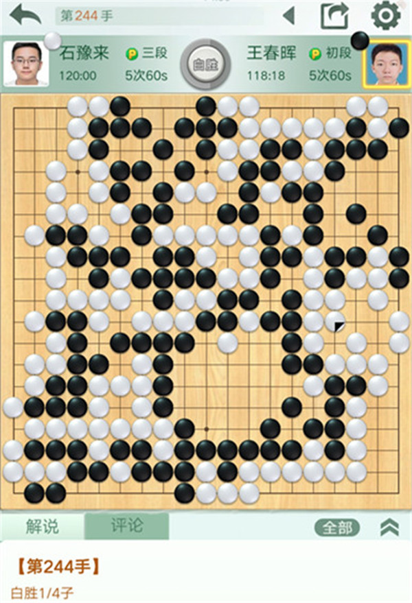 石豫來執(zhí)白對(duì)陣小將王春暉。雙方錯(cuò)進(jìn)錯(cuò)出,最終黑棋小官子出現(xiàn)問題,白棋幸運(yùn)1/4子獲勝。