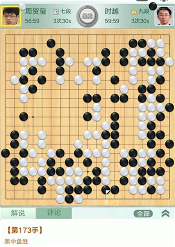 時(shí)越快棋執(zhí)黑對(duì)陣周賀璽。中盤黑棋在右邊沖擊白棋時(shí)候,白棋沒有下出一路立的妙手,而是選擇了做劫,劫爭轉(zhuǎn)換后黑棋全吃右邊大棋,已成勝勢(shì)。之后黑棋又在下邊白空出棋再活出一塊,中盤獲勝。