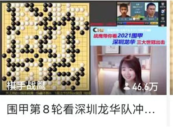 形勢(shì)大好,深圳龍華隊(duì)網(wǎng)上直播合作人,虎牙直播間圍棋知名主播戰(zhàn)鷹這里自然也是“門庭若市”,人數(shù)沖上46萬大關(guān)。賽后,石豫來到直播間作客,小帥哥自然受到熱捧!深圳龍華隊(duì)的后續(xù)戰(zhàn)況仍將在這里直播哦,關(guān)注戰(zhàn)鷹講棋,人美、棋強(qiáng)、口才好,是知名的圍棋主播。