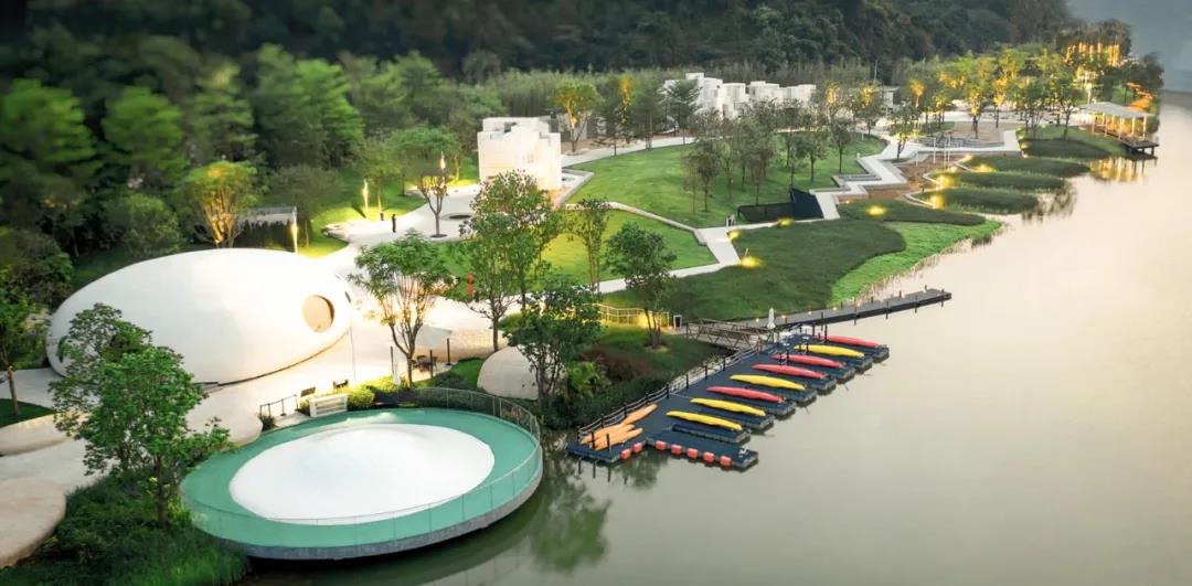 小鎮(zhèn)除規(guī)劃有安藤忠雄禮堂四部曲之一的“詩之禮堂”,還邀請了國內外一眾頂級設計師參與設計,張?zhí)凭坝^作品——龍骨樂園、WATG作品——棕櫚樹酒店、鄭東賢作品——高街,還有MORSE COFFEE、社交廚房、深夜食堂等配套建筑,實現(xiàn)居住、休閑、度假、教育、社交和精神文化等空間一體融合,締造了大灣區(qū)首選的深度休閑度假目的地。