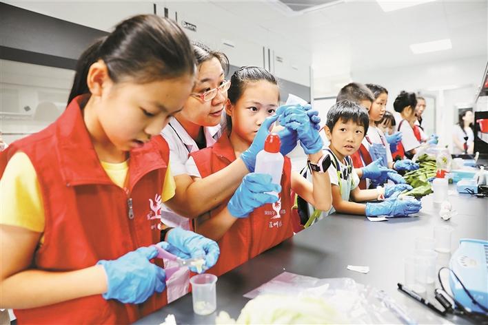 市農(nóng)檢中心副主任王多加給參加活動的孩子講解食用農(nóng)產(chǎn)品檢測流程。