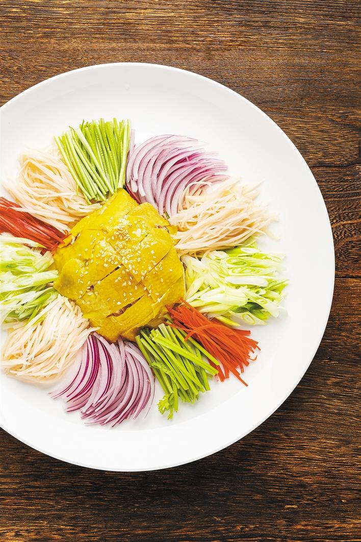 “撈”在粵語(yǔ)中有工作有錢賺的意思,祝愿來年風(fēng)生水起。徐師傅采用遠(yuǎn)近馳名的葵花雞??u顧名思義,由新鮮的葵花盤、葉、桿等炮制而成的飼料喂養(yǎng),以葵花桿榨成的汁解渴,是十足的“雞中貴族”。徐師傅選用講究的雞肉來準(zhǔn)備這道講究的菜,寓意前來用餐的賓客在來年可以步步高升、事事順利。將葵花雞、子姜絲、洋蔥絲、香菜段等各式新鮮食材撈到一起,齊齊起筷,高呼:“齊齊撈起,撈到風(fēng)生水起!”