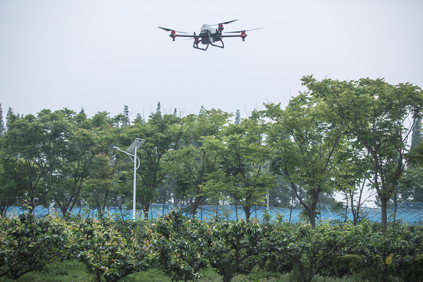 (上海首個盒馬村,翠冠梨數(shù)字農(nóng)業(yè)基地,無人機正在低空施藥)