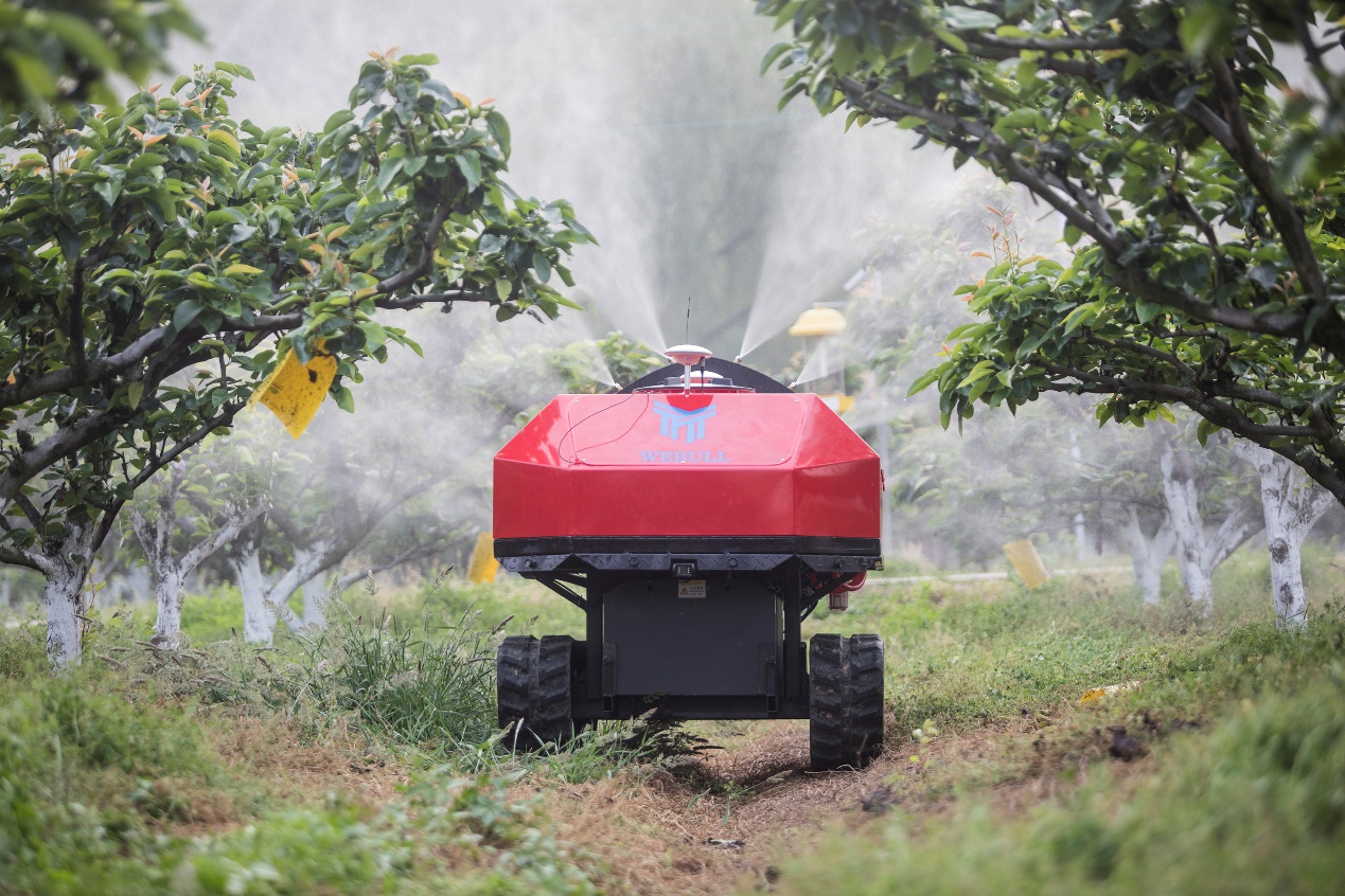 (翠冠梨數(shù)字農(nóng)業(yè)基地的無人值守果園機器人正在田間施藥,農(nóng)民可遠程操控)
