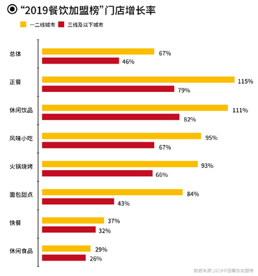 據(jù)“2019中國(guó)餐飲加盟榜”發(fā)布的數(shù)據(jù)顯示,2019年上榜的100家加盟品牌中,在一二線城市,百大上榜品牌門店數(shù)的增長(zhǎng)率平均值為67%,顯著高于中國(guó)餐飲連鎖品牌整體增長(zhǎng)率;在三線及以下城市,百大上榜品牌門店數(shù)的增長(zhǎng)率平均值為46%。正餐與休閑飲品兩大品類在一二線城市城市門店數(shù)的增長(zhǎng)率更是超過(guò)了100%。