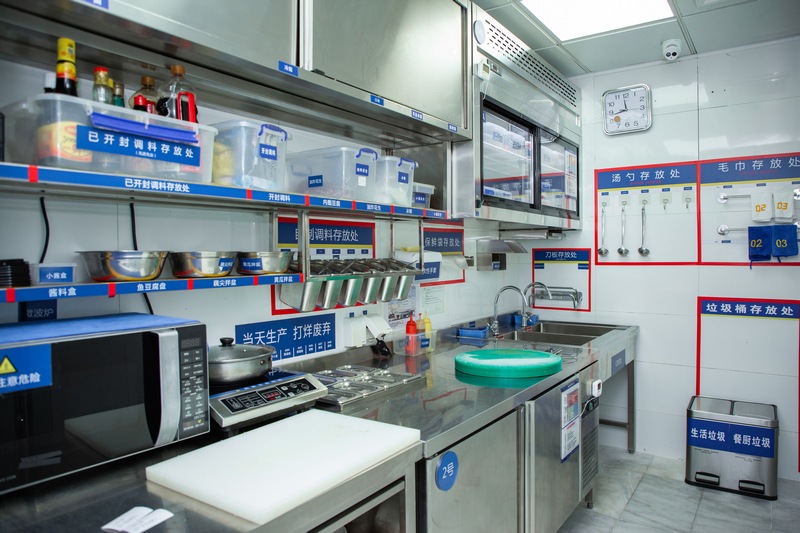 “右手邊是冷菜間,因?yàn)槭嘲惨蟾撸覀兌加袑iT(mén)的‘二次更衣室’,在這里更換衣服后,再進(jìn)入對(duì)涼菜進(jìn)行處理?!必?fù)責(zé)人表示,在專門(mén)的涼菜區(qū)里,則可以看到櫥窗中整齊地貼上了諸如“A1圣女果”“B04魚(yú)豆腐”之類的標(biāo)簽,同時(shí)備注“當(dāng)天生產(chǎn)打烊廢棄”和“加工日期與廢棄日期”等具體操作指示?!懊客泶蜢群螅覀円矔?huì)用紫外線燈對(duì)冷菜間進(jìn)行半個(gè)小時(shí)的消毒?!必?fù)責(zé)人補(bǔ)充。