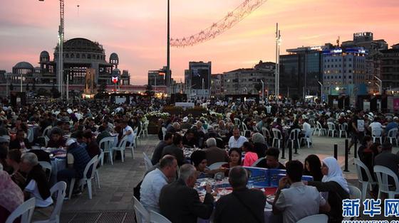 5月16日,在土耳其伊斯坦布爾塔克西姆廣場,民眾在吃晚餐。日落后,伊斯坦布爾各城區(qū)為民眾提供免費晚餐,慶祝齋月首日。