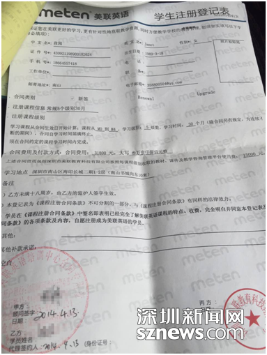 段女士告訴記者,2014年她在網(wǎng)上與美聯(lián)英語的客服人員取得聯(lián)系后,便前往南山區(qū)海印長(zhǎng)城二期1-2層的美聯(lián)英語中心試聽課程,并于當(dāng)年4月報(bào)讀了M0—M4五個(gè)級(jí)別共31800元的課程。段女士當(dāng)時(shí)選擇的是分期付款方式,在完成首付3200元后,其余的金額由銀行每月自動(dòng)扣除1100余元。截至目前,段女士已連續(xù)繳費(fèi)22個(gè)月。