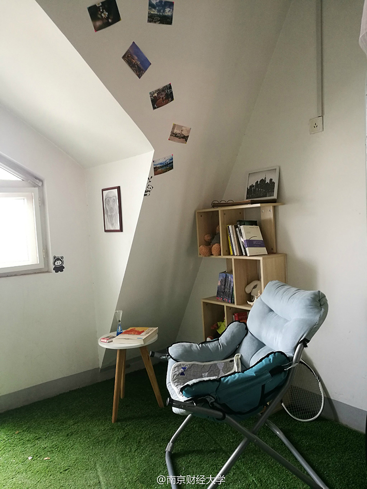 綿綿的草坪、充滿設(shè)計(jì)感的書架、掛著素描畫的墻……難以想象這是四個(gè)19歲男生的寢室。南京財(cái)經(jīng)大學(xué)西苑9幢男生宿舍頂樓602寢室,住著4位“世外高人”—— 涂貴平、柯毅、劉以康和廉鎮(zhèn)宇,他們用事實(shí)告訴大家,男生宿舍文藝起來,可絲毫不輸女生。圖/@南京財(cái)經(jīng)大學(xué)