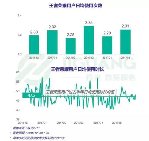 根據(jù)極光大數(shù)據(jù)的統(tǒng)計,《王者榮耀》用戶白天游戲高峰時段為12:00-13:00,占比為6.97%;晚間游戲高峰為21:00-23:00,共占比13.63%在過去的半年里《王者榮耀》日均使用次數(shù)在2.3次左右,日均使用時長基本在40~55分鐘這一區(qū)間。從此處來看,其用戶使用情況并沒有達(dá)到一個與常規(guī)游戲差異巨大的程度。