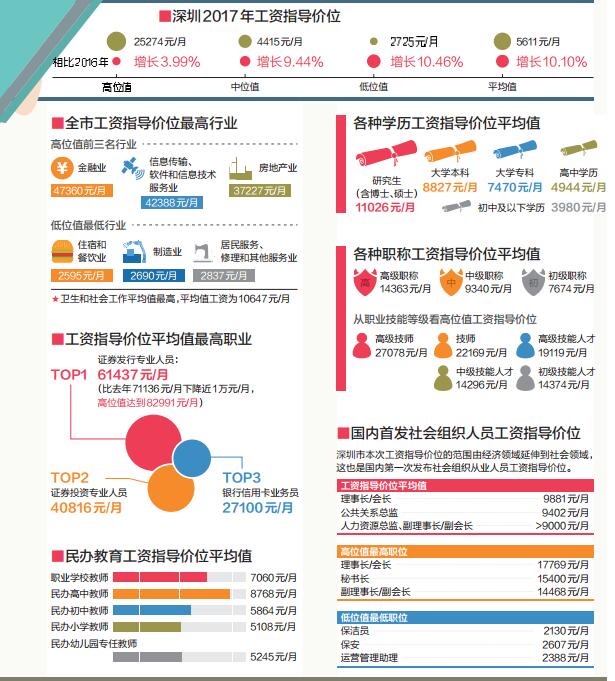 深圳哪些行業(yè)最有“錢(qián)途”?哪個(gè)職業(yè)最吸金?9月18日,由深圳市人社局發(fā)布的《2017年深圳市人力資源市場(chǎng)工資指導(dǎo)價(jià)位》顯示,2017年,深圳工資指導(dǎo)價(jià)位平均值為5611元/月,比去年上漲10.10%。在508個(gè)職業(yè)中,證券發(fā)行專業(yè)人員依然最吸金,工資指導(dǎo)價(jià)位平均值為61437元/月。此外,深圳今年還首次發(fā)布社會(huì)組織從業(yè)人員工資指導(dǎo)價(jià)位。