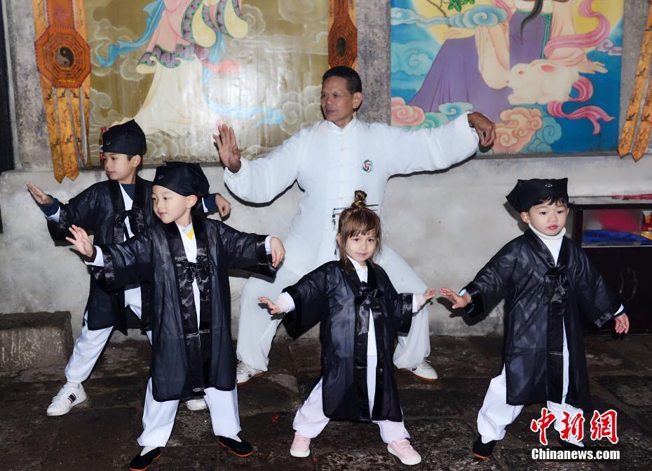 10月16日,在“道教名山”、世界自然遺產(chǎn)地江西上饒三清山,5名來(lái)自中外的萌娃身穿統(tǒng)一道服,手持竹簡(jiǎn),在三清宮跟著道教師傅朗讀《道德經(jīng)》、《弟子規(guī)》,學(xué)習(xí)太極拳、書(shū)法、古箏等中國(guó)傳統(tǒng)文化。這群萌娃中年齡最小的僅11個(gè)月,年齡最大也只有6歲。程希雪攝