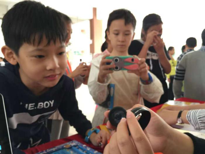 科普益智互動(dòng)游戲精彩紛呈,深圳阿卡索資訊股份有限公司的華容道大闖關(guān)、筷子夾彈珠互動(dòng)游戲極大激發(fā)了同學(xué)們的參與熱情。深圳市夢(mèng)飛翔文化傳播有限公司及深圳諾必達(dá)節(jié)能環(huán)保有限公司的智能陪伴機(jī)器人能詩(shī)歌能朗誦,“通今博古”能答疑解惑,成為同學(xué)們的良師益友。各種技能培訓(xùn)在其中兩家學(xué)校同步開展,包括中廣和(深圳)科技有限公司的兒童護(hù)理實(shí)用技能、深圳光影教育投資有限公司的手機(jī)和單反使用講座、深圳市海文深生物科技有限公司的牙膏制作工藝展示等項(xiàng)目,讓孩子們收獲不少生活技能。