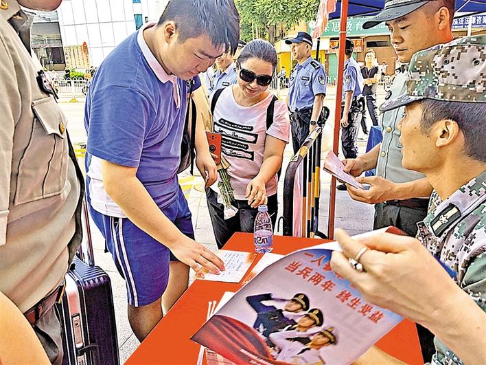 6月8日下午,征兵工作人員在龍華中學(xué)考點(diǎn)外開展了針對(duì)高考考生的征兵宣傳。