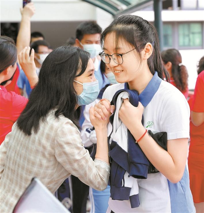 準(zhǔn)備進(jìn)入考場的育才中學(xué)考生與老師微笑握手,帶著老師的美好祝愿自信面對人生大考。深圳特區(qū)報(bào)記者周紅聲攝