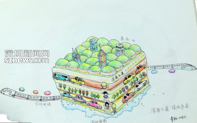 青松告訴記者,2008年剛到深圳時(shí),他就被市民中心的造型所吸引,畫下了上面這幅畫